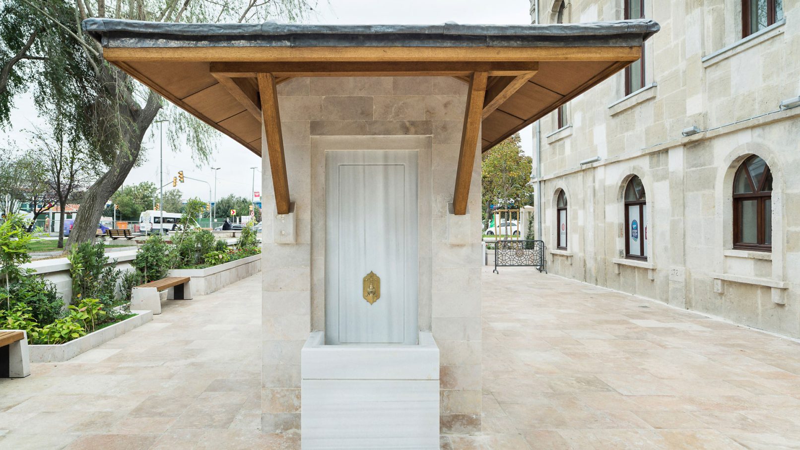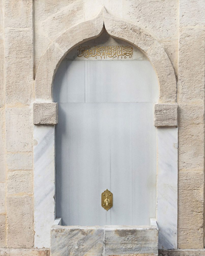 Şadırvanın ön cephesi caminin taş avlusuna bakar. Bu cephede bir çeşme yer alır, ve çeşmenin tam karşısına avluyu gölgeleyecek bir ıhlamur ağacı yerleştirilmiştir.