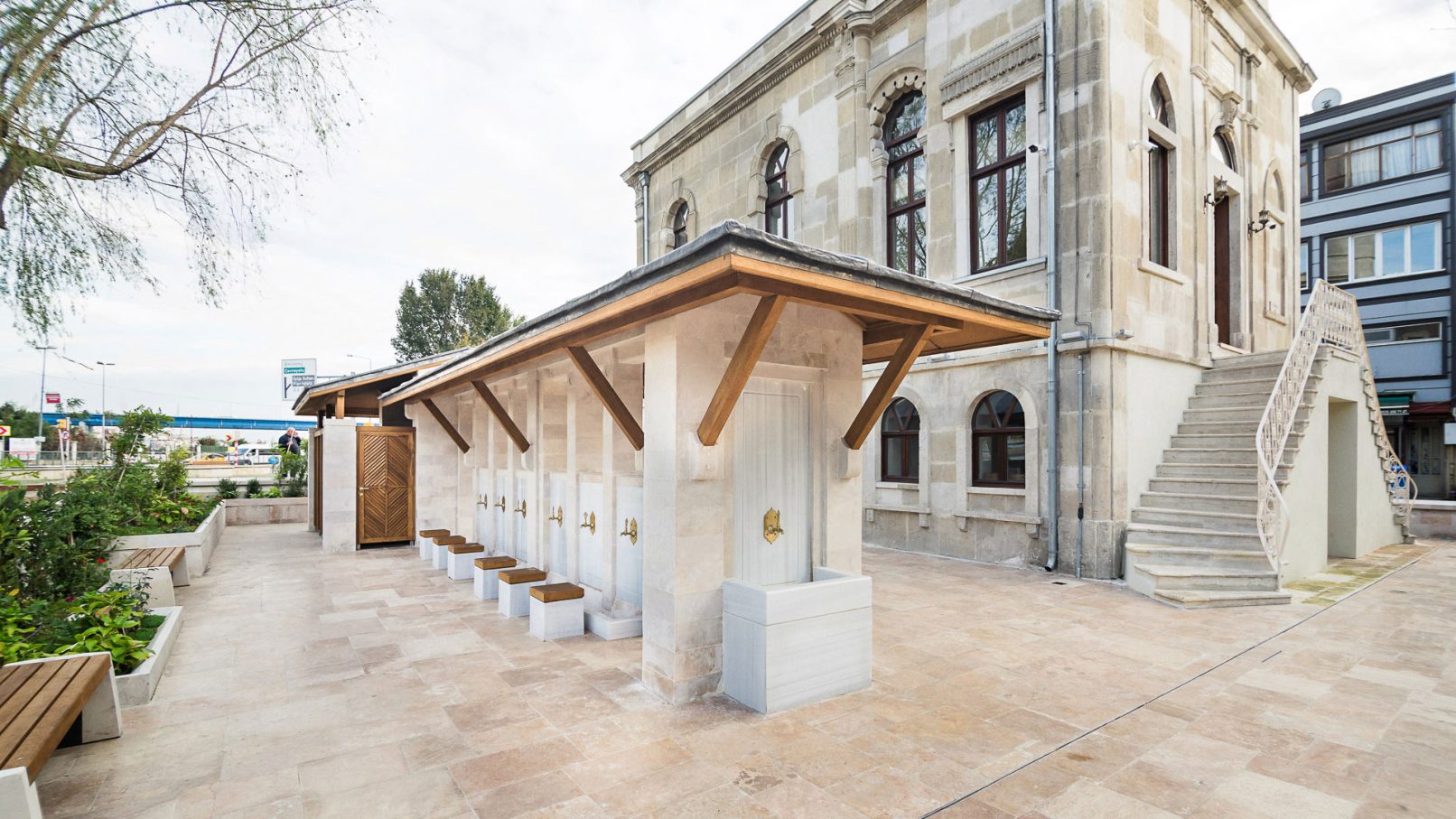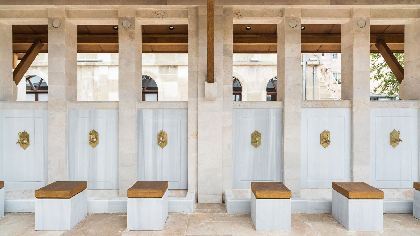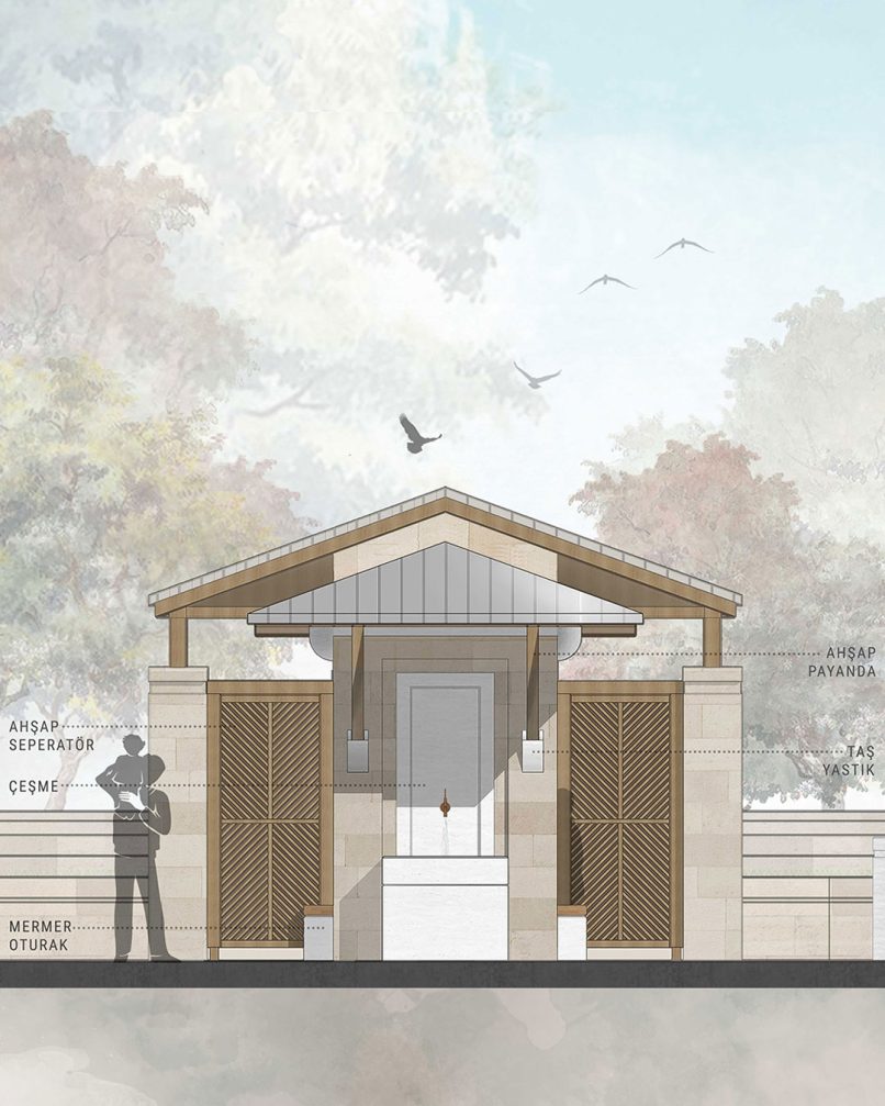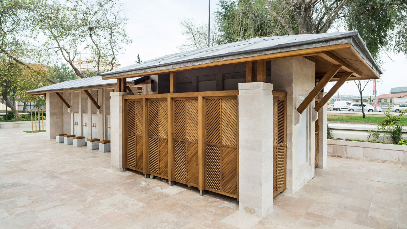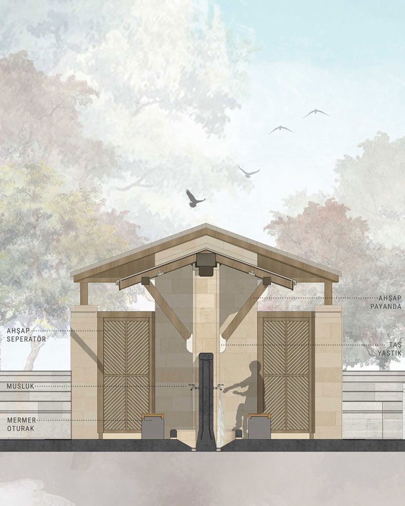 Arka cephede ise kadınların açık havada abdest almasına imkân veren ahşap kajlarla görsel olarak perdelenmiş ama havadar / yarı açık bir mekân bebek bakım odası ile birlikte yer alır.