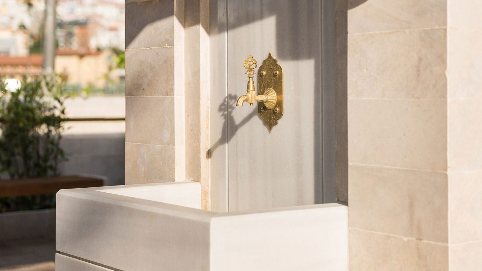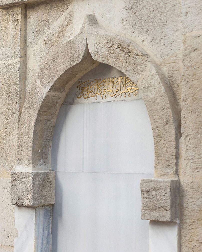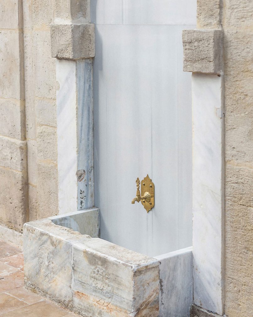 Şadırvanın erkekler ve kadınlar bölümü vardır, cami ile mütevazi bir ilişki kurarken caminin avlu mekânını da belirler. Cami fevkânî olduğu için altındaki mekânlar atölye / dükkân olarak kullanılacaktır, bu dükkânların ulaşılabilir olması için cami duvarları alçak sınır elemanları olarak tasarlanmıştır. Avluya giriş noktaları ise fener gibi yükselen taş babalar ile vurgulanmıştır.