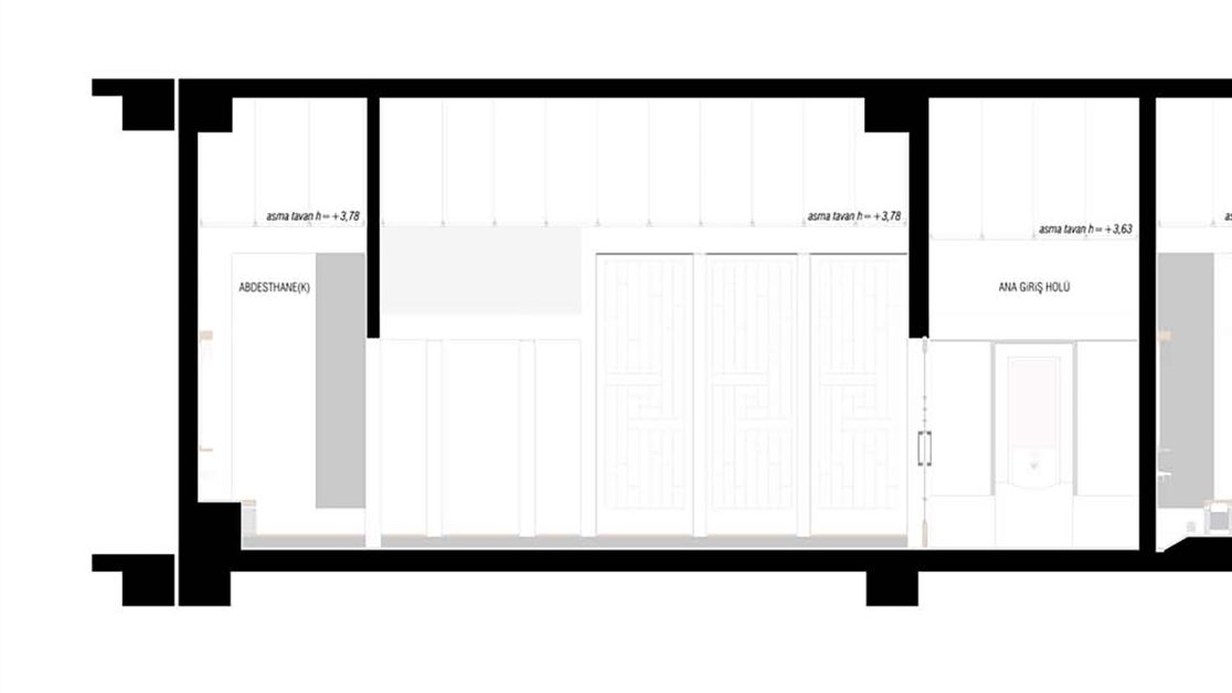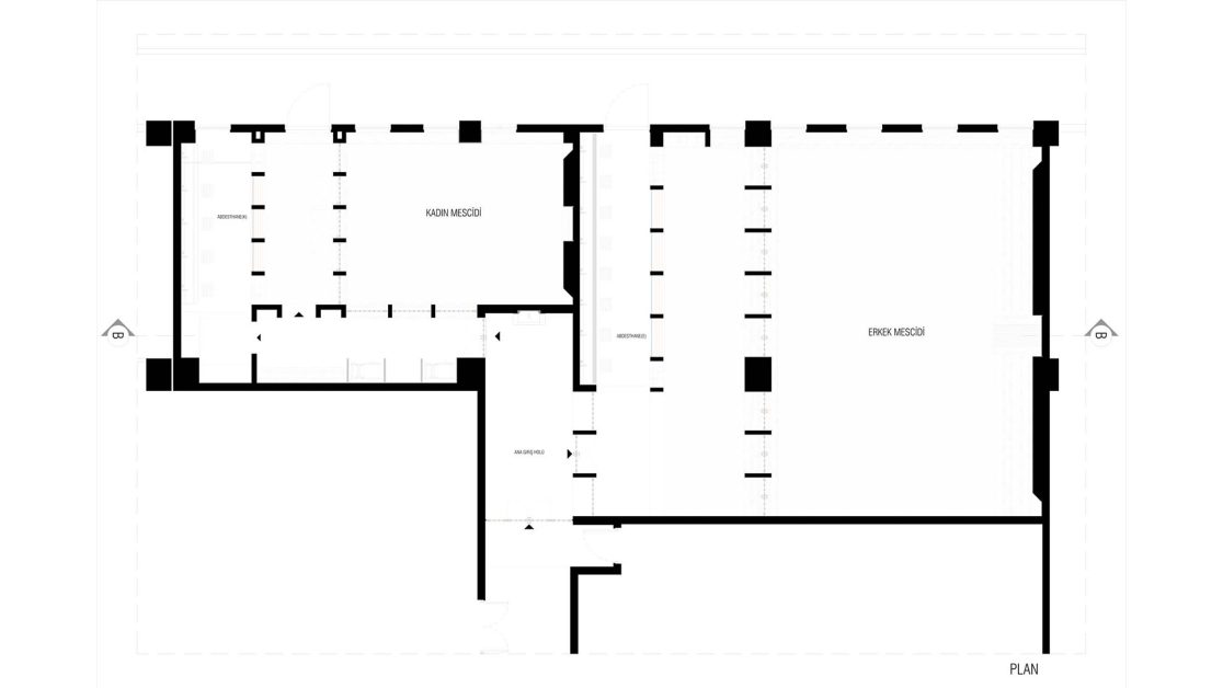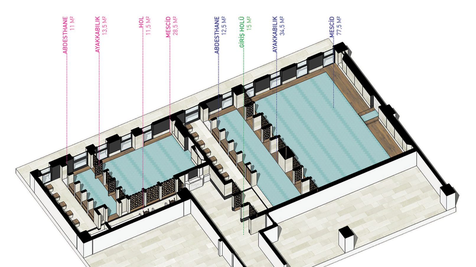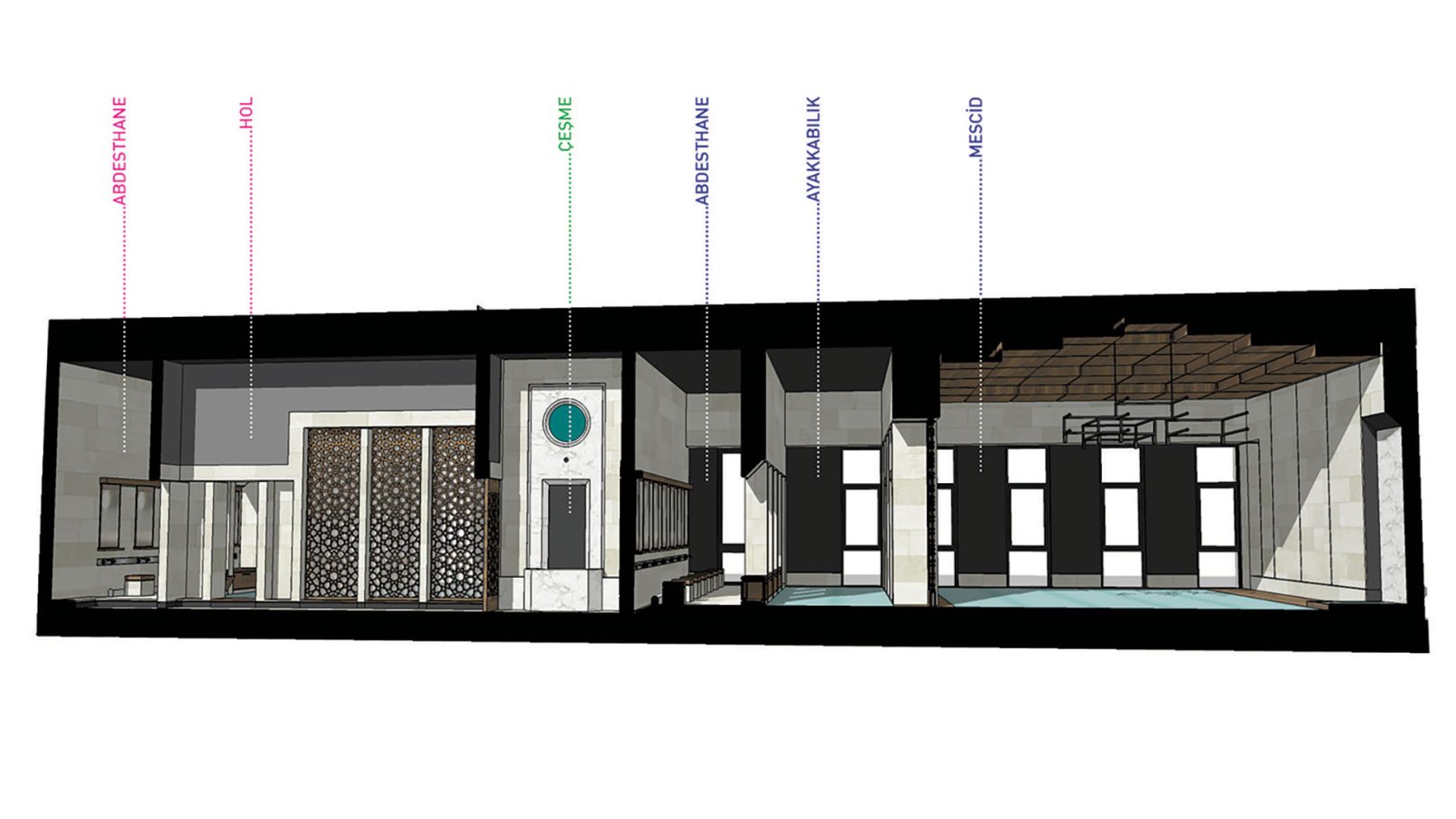 Abdesthane, giriş ve kadın-erkek mescidleri tek bir bütünlük içinde kurgulanmıştır. Bu bütünlükte amaç, her bir işlevin diğerine saygılı bir konumda yer alması, böylece ibadet öncesi ve sonrası hareketin doğal bir akışa kavuşmasıdır.