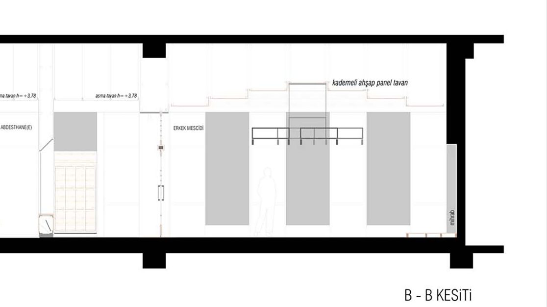 Tavanda ahşap kurgulu modüler ızgara sistemi geometrik bir ritim oluşturur. Bu ritim, geleneksel merkezi mekân düzenini çağdaş bir ifadeyle yeniden yorumlar. Zemin, desenli halı yüzeyiyle kıble yönünü işaretler, mihrap duvarında kullanılan yeşil renkli taş, sade bir vurgu elemanı olarak bütünlüğü tamamlar.