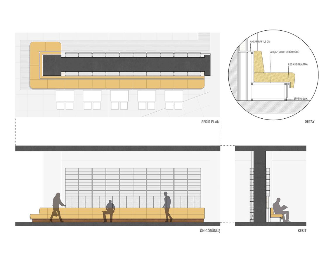 Malzeme seçiminde sıcak ahşap dokular, endüstriyel yüzeylerle denge içinde kullanıldı. Raf düzenleri, aydınlatma elemanları ve renk geçişleri, kitapların çeşitliliğini ve zenginliğini öne çıkaran bir sahne etkisi yaratır.