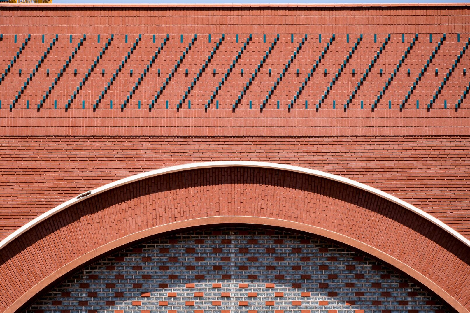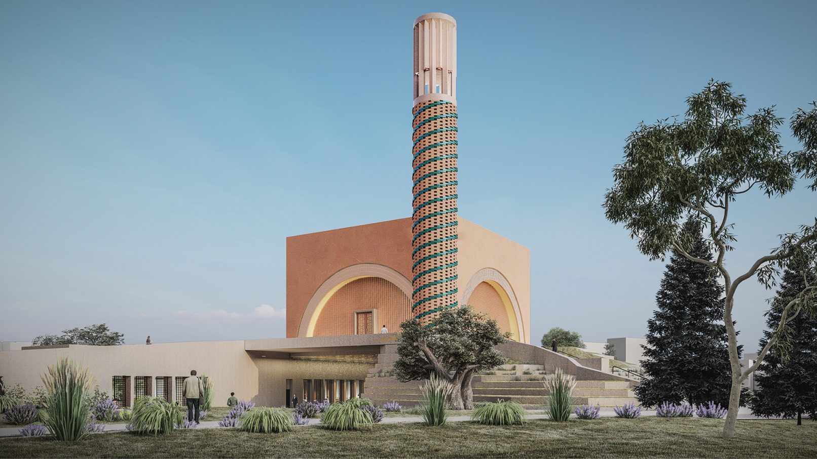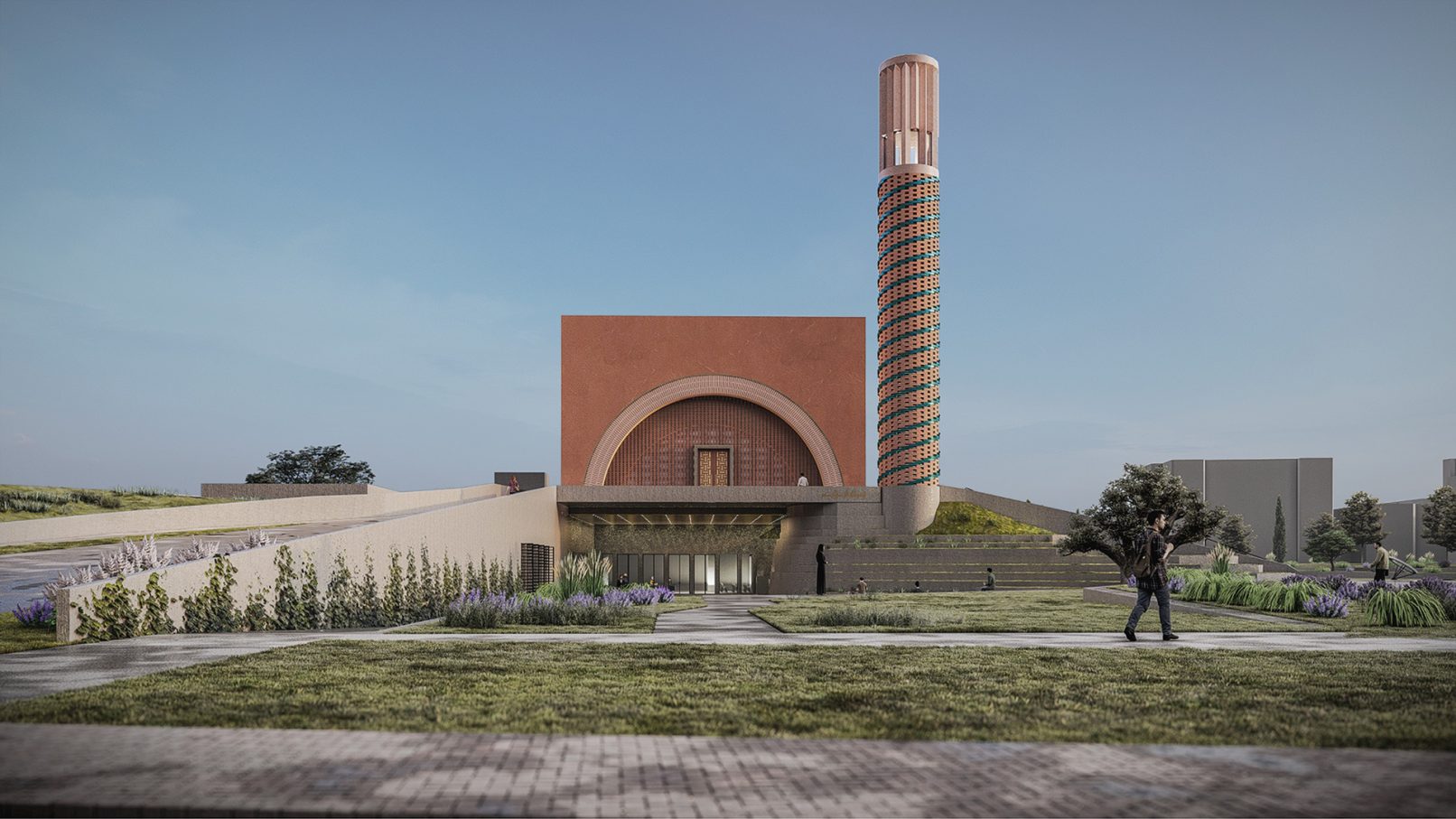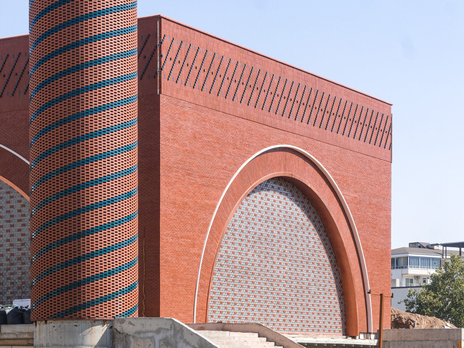 Tuğlanın farklı ve zengin işlenme biçimleri, hem cephelerde hem de minarede güçlü bir ifade aracı olarak tasarlandı. Sırlanmış tuğlaların ardışık düzeniyle bezenmiş minare, geleneksel malzemenin çağdaş bir yorumu olarak göğe yükselirken, cephelerdeki dolu-boş düzeni ışıkla oyunlar yaratarak mekânın atmosferine katkı sağlıyor. İç mekânda büyük kemerli açıklıkların arkasında örgü duvarlarla sağlanan geçirgenlik, ibadet mekânını dışarıdaki park yaşamıyla ilişkilendiriyor.
