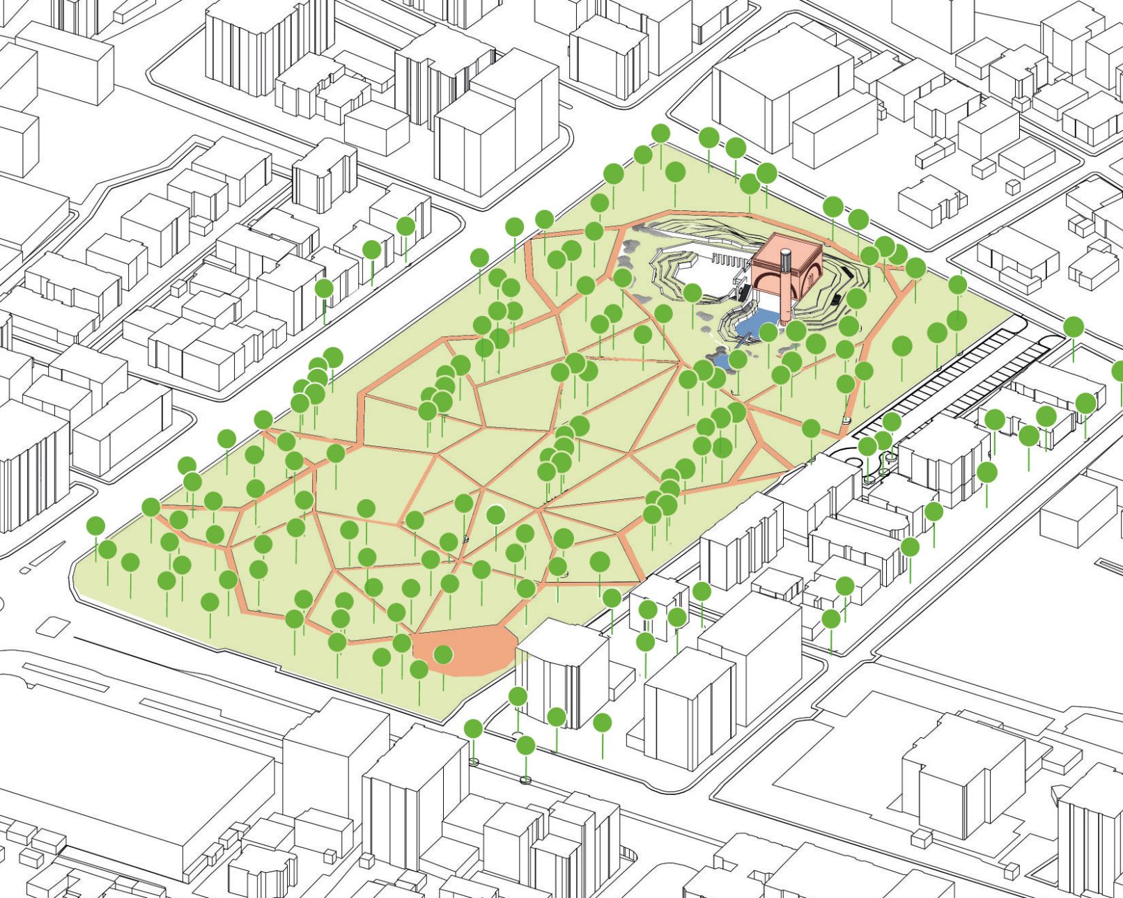 Yapının mekânsal kurgusu, parkın doğal dokusu ile yapay geometrinin karşılaşması üzerine kuruldu. Topoğrafyanın bir kısmının kabartılması ve diğer kısmının çökertilmesiyle elde edilen meydan, projeyi kentin yoğun dokusundan ayırıyor ve kamusal dolaşımı zenginleştiriyor. Bu meydanın çevresinde kurgulanan fonksiyonlar, organik park alanından yavaş yavaş insan yapısı hacimlere geçiş sağlıyor.