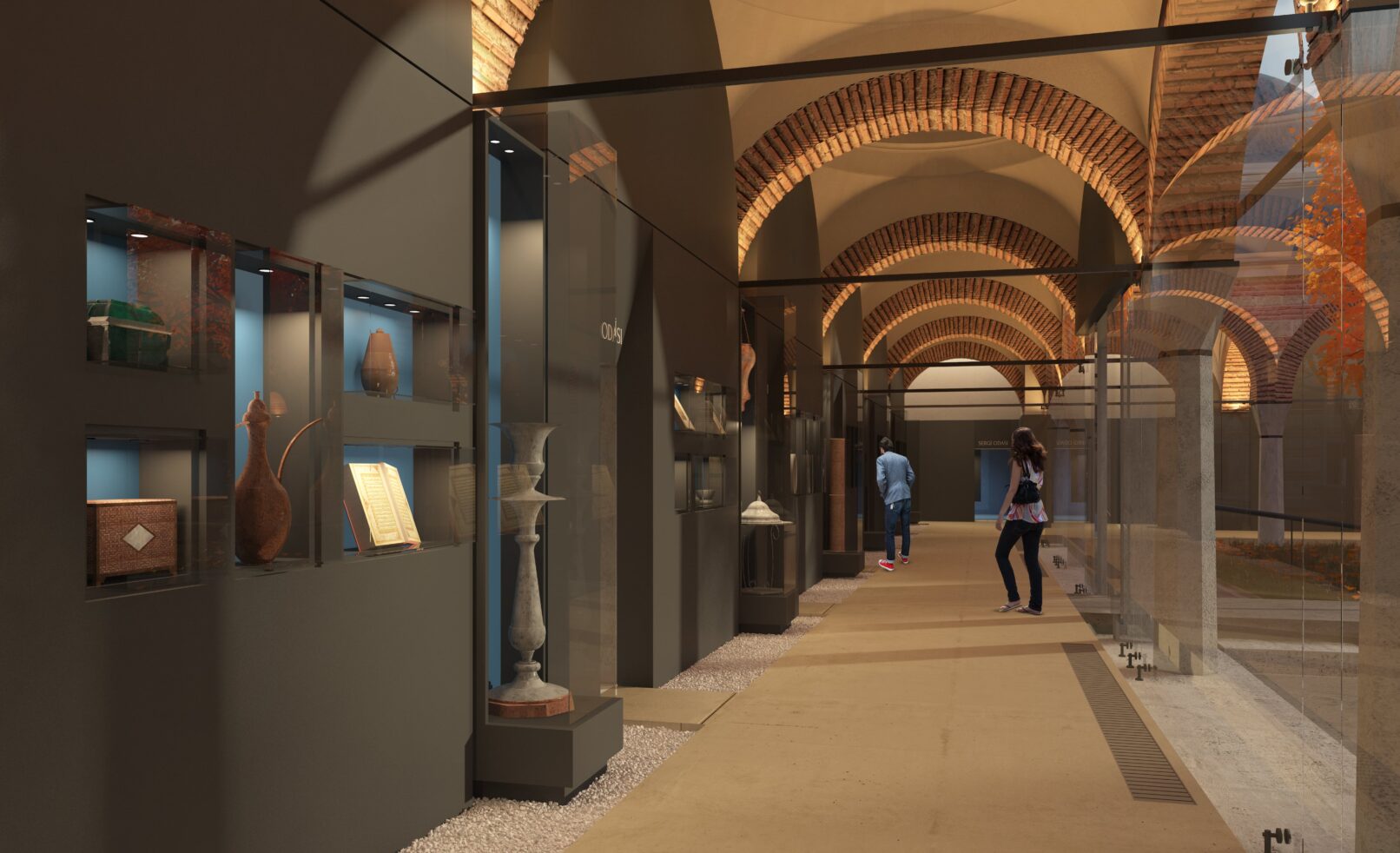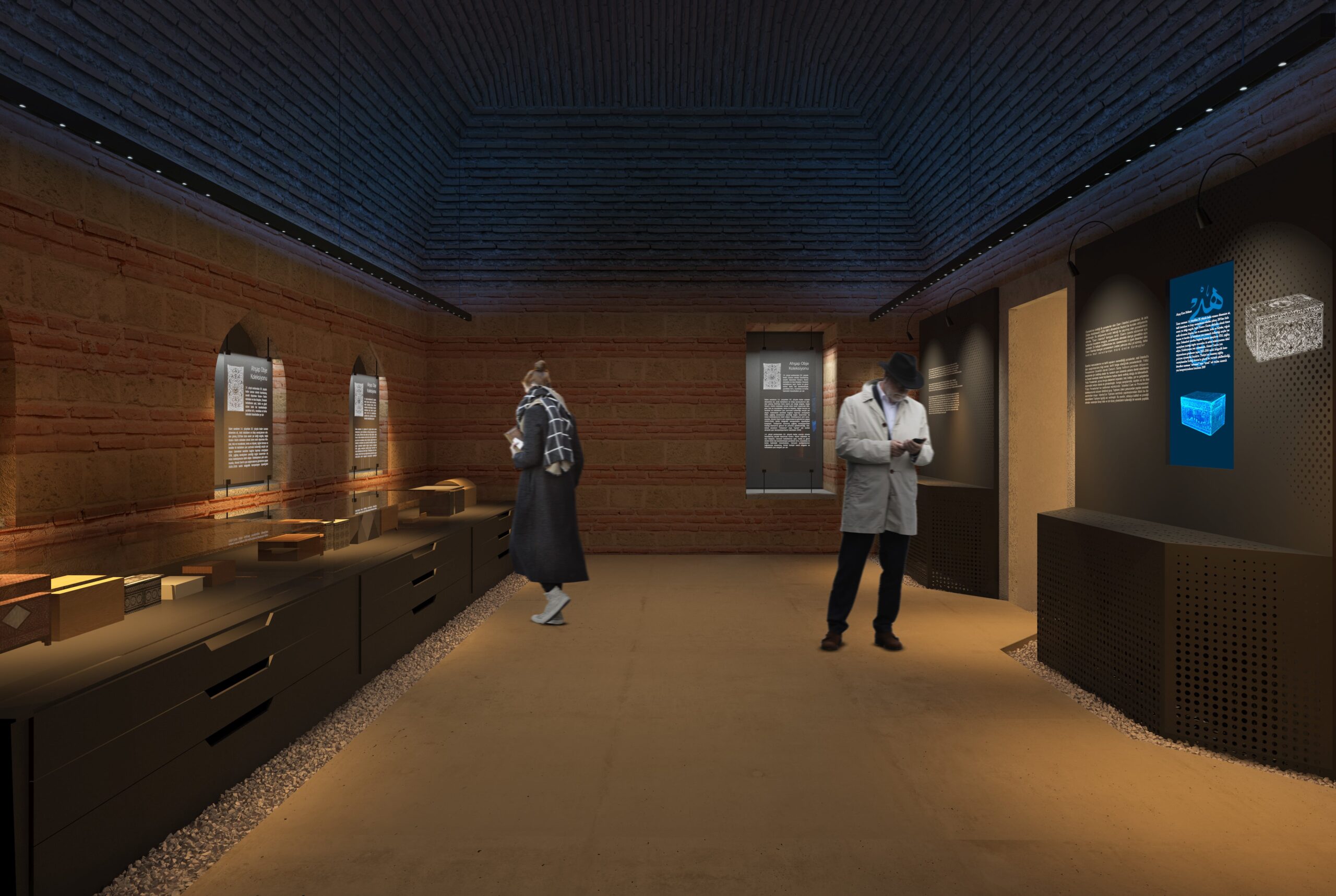 Müze tasarımı, tarihî yapının dokusuna mümkün olan en zarif müdahaleyi benimsemiş, özgün duvar örgüsü, kemerler ve tonozlar olduğu gibi korunmuştur. Yeni müze kurgusu, mekânın içine yerleşen bağımsız, ikinci bir katman olarak düşünülmüştür. Bu katman, yapıya dokunmadan içinde gezilebilen, objeleri karanlık bir fonda öne çıkaran çağdaş bir sergi dili kurar. Siyah tonlardaki sergileme panelleri ve kontrollü ışık kullanımı, hem envanterin anlam dünyasını hem de sessizliğin estetiğini öne çıkarır.