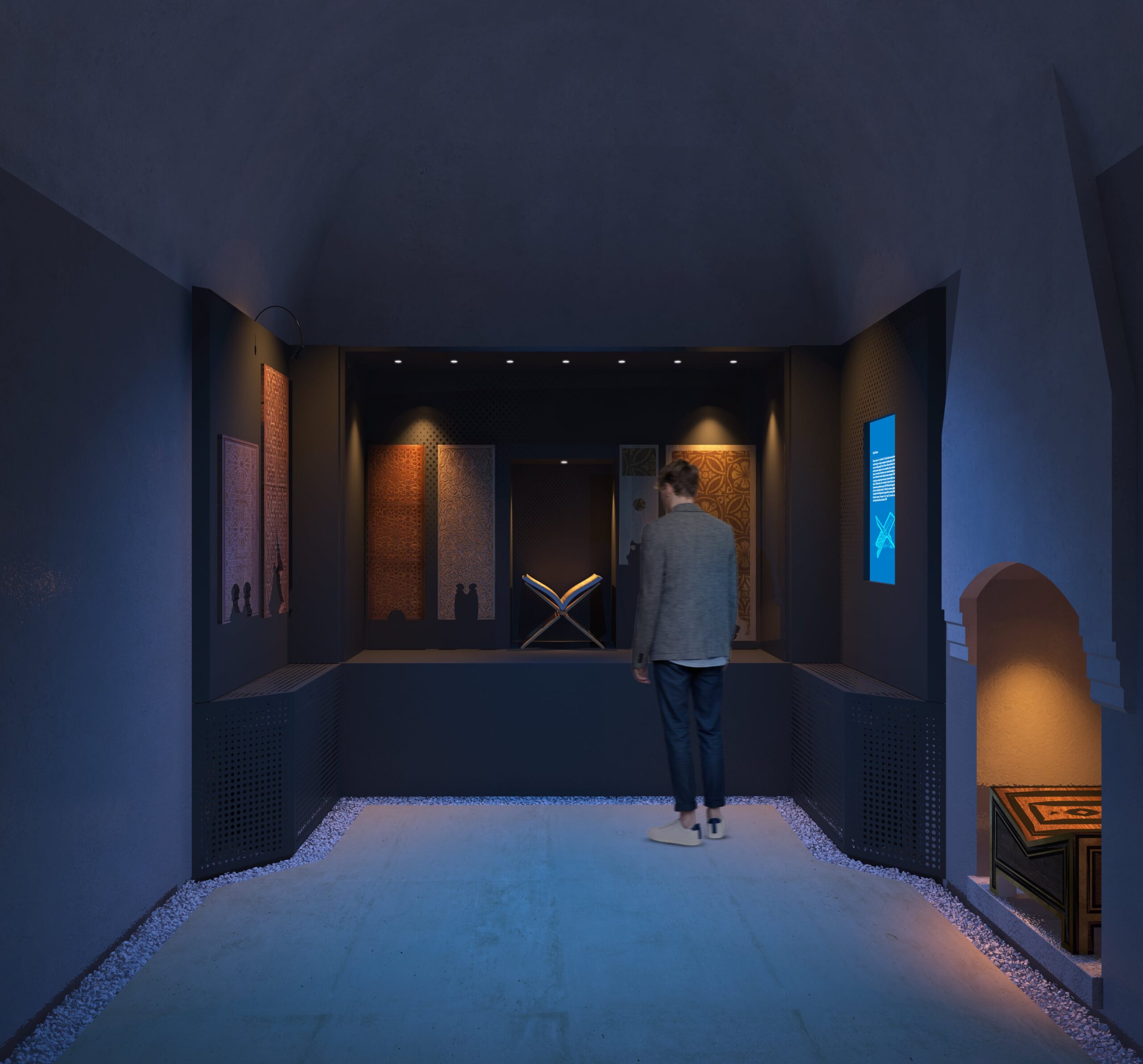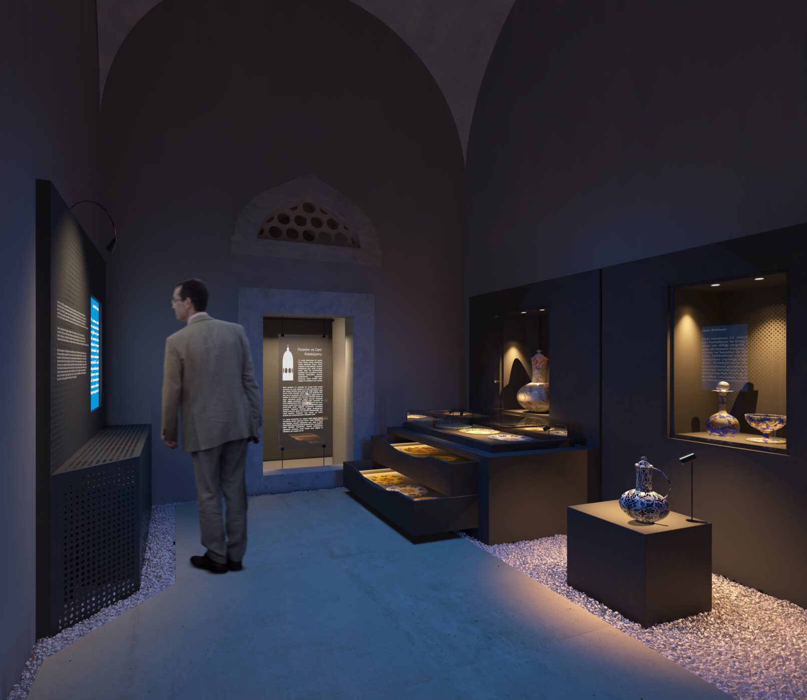 Avludan medrese odalarına geçişte, cam yüzeylerle oluşturulan yarı geçirgen sınırlar, hem iç-dış ilişkisini korur hem de ziyaretçiyi tarihî avlu atmosferiyle bağdaştırır. Sergi odalarında kullanılan soğuk ışık-gölge kontrastı mekânın içe dönük doğasını pekiştirirken, objelerin kendi hikâyelerini sessizce anlatmalarına imkan tanır. Işık, burada anlatının asli unsuru haline gelir, objelerin üzerine düşen bir vurgudan çok, mekânın ruhunu yeniden kuran bir araç olarak.