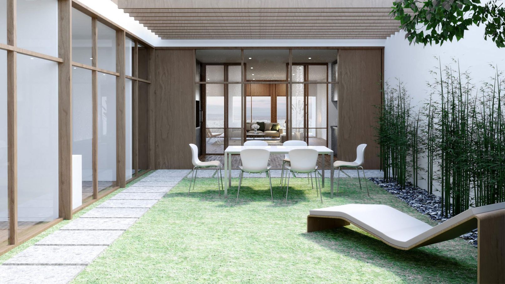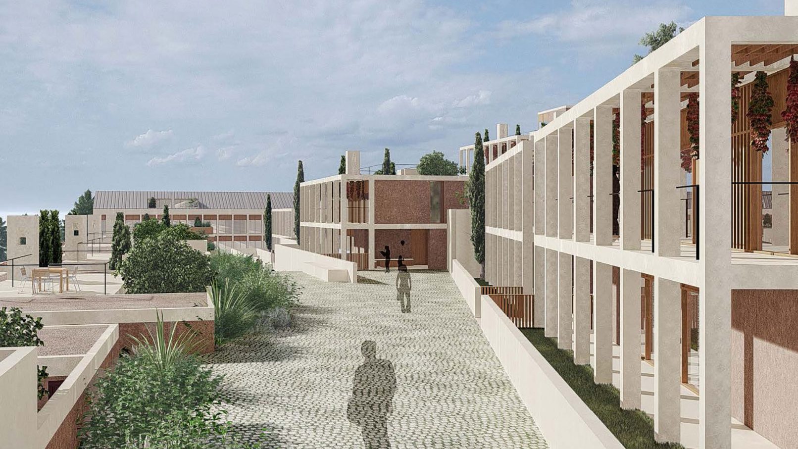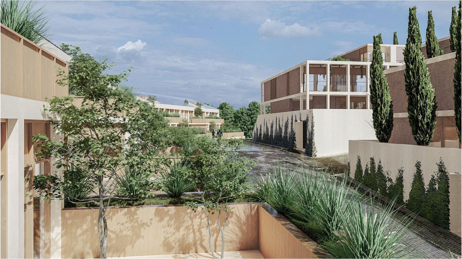 Kütlelerin ritmik tekrarları, ahşap, taş ve sıva yüzeylerle desteklenen sade bir malzeme diliyle tanımlanmıştır. Bu yaklaşım, doğal ışıkla etkileşen bir mimari atmosfer üretir. Kamusal alanlar, avlular, su yüzeyleri ve yeşil teraslar yerleşimin sosyal dokusunu güçlendirir.